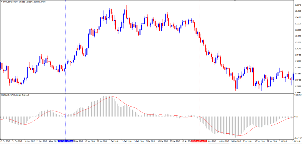 Chỉ báo Phân kỳ hội tụ trung bình động (MACD) giúp các nhà giao dịch xác định xu hướng bằng cách tính giá trung bình của chứng khoán trong một khoảng thời gian cụ thể. Chiến lược giao dịch theo xu hướng này là hiệu quả nhất vì nó liên quan đến việc một số nhà giao dịch tham gia vào các vị thế mua trong khung thời gian mà đường trung bình động ngắn hạn cao hơn đường trung bình động dài hạn.