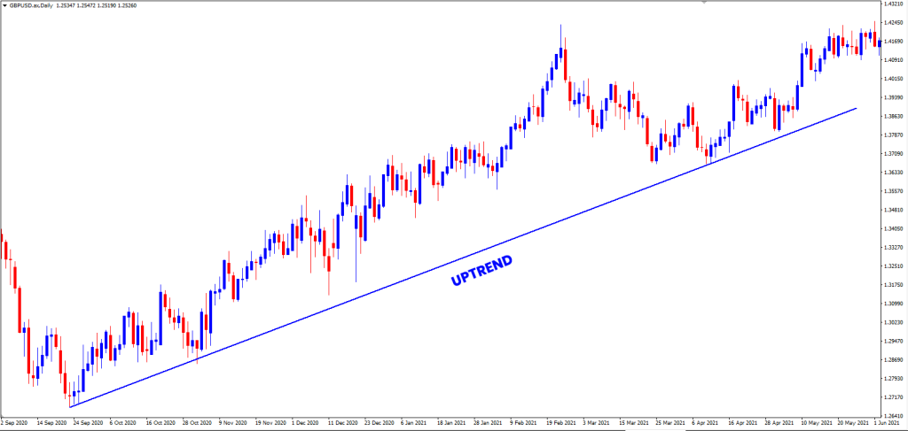 Xu hướng tăng là xu hướng tăng trên thị trường. Điều này ngụ ý rằng giá của một loại tiền tệ sẽ tiếp tục tăng theo thời gian. Kết quả là sẽ có các đỉnh cao hơn sau các đáy và các đáy cao hơn sau các đỉnh.
