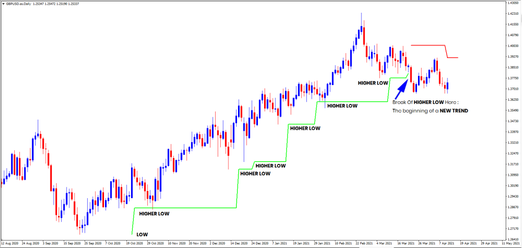 - Khi một mức dao động thấp của một xu hướng tăng bị phá vỡ hoặc một mức dao động cao của một xu hướng giảm bị phá vỡ, hướng của xu hướng sẽ thay đổi.