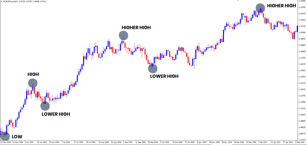 Một cách rất dễ dàng để xác định xu hướng là xem các biểu đồ để biết mức cao và mức thấp. Một xu hướng tăng trong bối cảnh này có nghĩa là giá đang tạo ra một loạt các đỉnh cao hơn và đáy cao hơn.